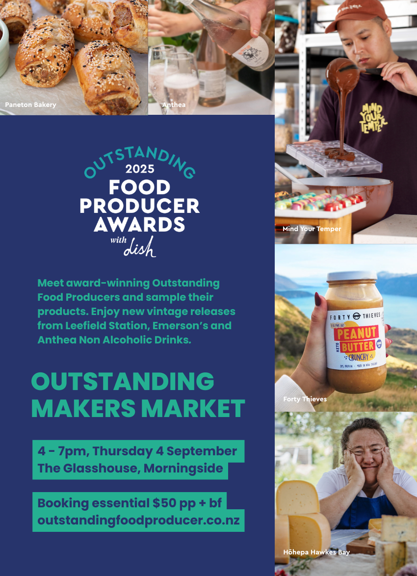 This intimate gathering is your chance to meet the Outstanding Food Producer winning artisans you’ve read about and admired. Mingle with the creative forces from champion brands including; Island Gelato Co., Mind Your Temper, The Kutai Guy, Forty Thieves, Hōhepa Hawke’s Bay, Molly Woppy, Kiki Seed Cracker Mix, Pepler’s, Anthea Non-Alcoholic, A Bit Dressy and Paneton Bakery. Explore their innovative new products and purchase award-winning products (get the jump on Christmas gift giving) in a relaxed and convivial setting. Plus look out for the teams from dish, and BYD as well as Leefield Station and Emerson’s who will be sampling new releases.