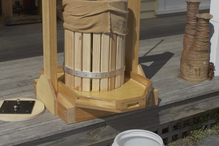 After the apples were passed through the insinkerator the pulp was put into the muslin cloth-lined barrel. When it was full, a wooden disc was put on the top and I wound the threaded rod down. My brother had welded a bolt to the top of the rod so I could use a power drill to wind it up and down quickly before moving to the hand crank for the pressing.