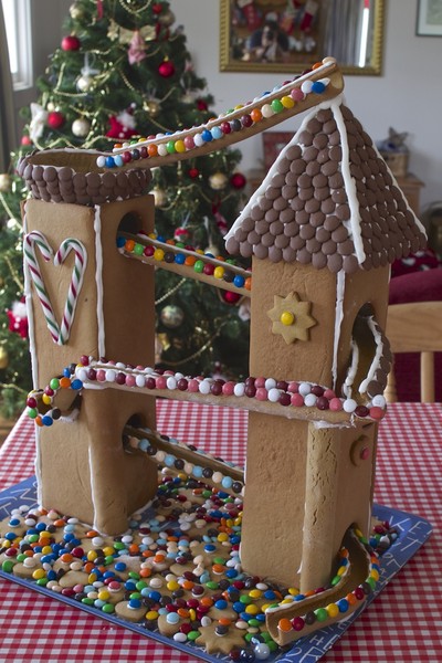 David's annual Christmas cider party features his homemade gingerbread houses, with a different design each year. This was 2014's.
