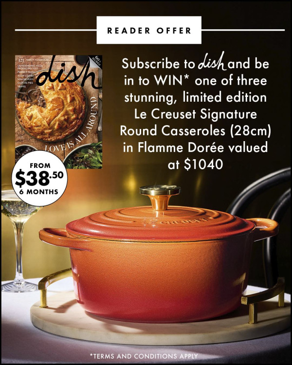 No issue of dish would be complete without one of our epic subscriber giveaways. This time, our subscribers have the chance to win 1 of 3 stunning, limited edition Le Crest Signature Round Casseroles (28cm) in Flame Dorée, valued at $1040.00. Our current subscribers are already in the draw, but if you’re not subscribed, click here now and be in to win.