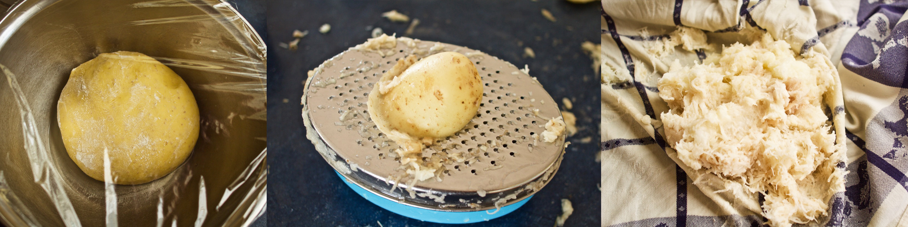On the other end of the spectrum, the Latkes caused me barely any grief at all. First, I grated the potatoes, it took me a while using a fine grater, and it was actually pretty messy, but I thought they looked really pretty in the picture in the book so hopefully it'd be worth it. I squeezed the grated potato through a clean tea towel to remove most of the liquid.