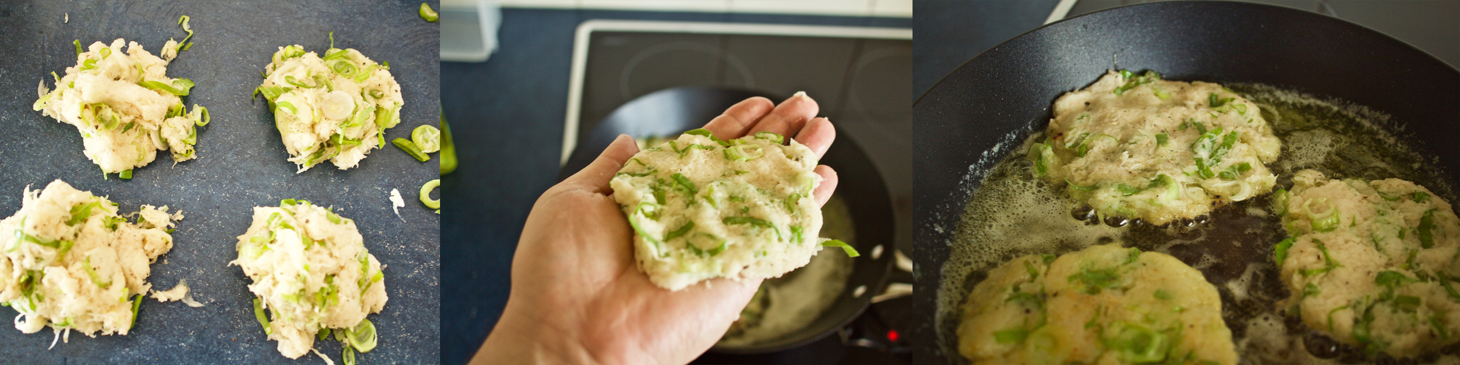 Then I sliced the spring onions finely and mixed the two together with salt and pepper. I divided the mixture and fried the potato pancakes in butter and oil for 4–5 minutes per side.