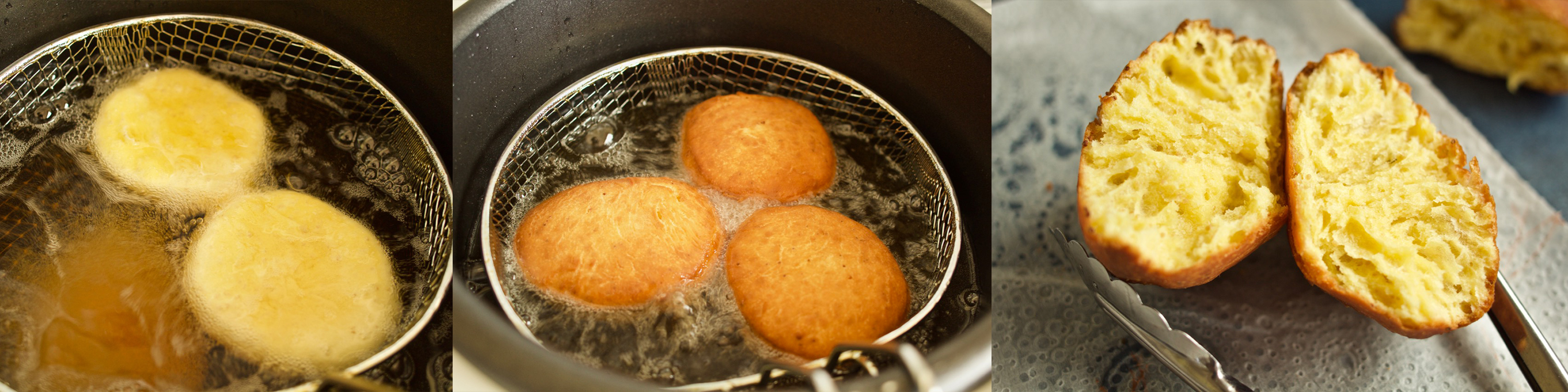 The next day, I bought new yeast but the dough still hadn't risen as much as I expected it would. I find that enriched doughs don't usually rise particularly well and this was certainly enriched, so I decided to go with it. I cut the doughnuts to size with a large mug and fried them one at a time at first so I could adjust the temperature so they cooked through perfectly.