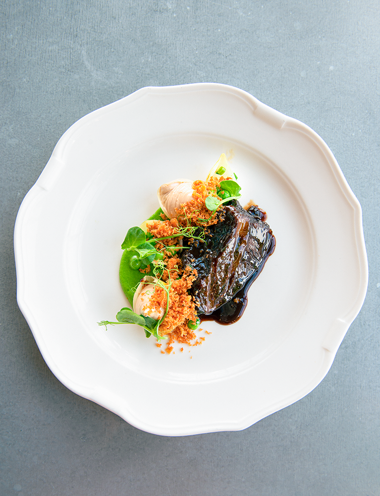 The meal began with plates of jewel-like yellowfin tuna, with heirloom tomato, yuzu and shiso accompanied by Church Road Hawke’s Bay Blanc de Blancs Methode Traditionnelle. Both main courses included pasture-raised, grass-fed meat provided by the Greenlea Butcher Shop. The first, Ovation lamb rack with white asparagus ‘barigoule’, pancetta and Ortiz anchovy, featured lamb that was pink, tender and beautifully textured. This was paired with the 2019 Church Road TOM Chardonnay, a surprising yet perfect match. The main event was beef cheek ‘Rossini’, with duck liver parfait, brioche and spring peas alongside Church Road’s 2015 TOM Syrah. The export-quality beef provided by the Greenlea Butcher Shop was meltingly tender and indulgently delicious. To finish, Gareth had prepared ‘banana, banana, banana’, warm banana cake served with salted chocolate ganache and toffee ice cream, served with Church Road’s 2018 Grand Reserve Noble Pinot Gris. During the evening Chris and Gareth walked us through the menu and wines, while the happy hum in the room grew progressively louder.