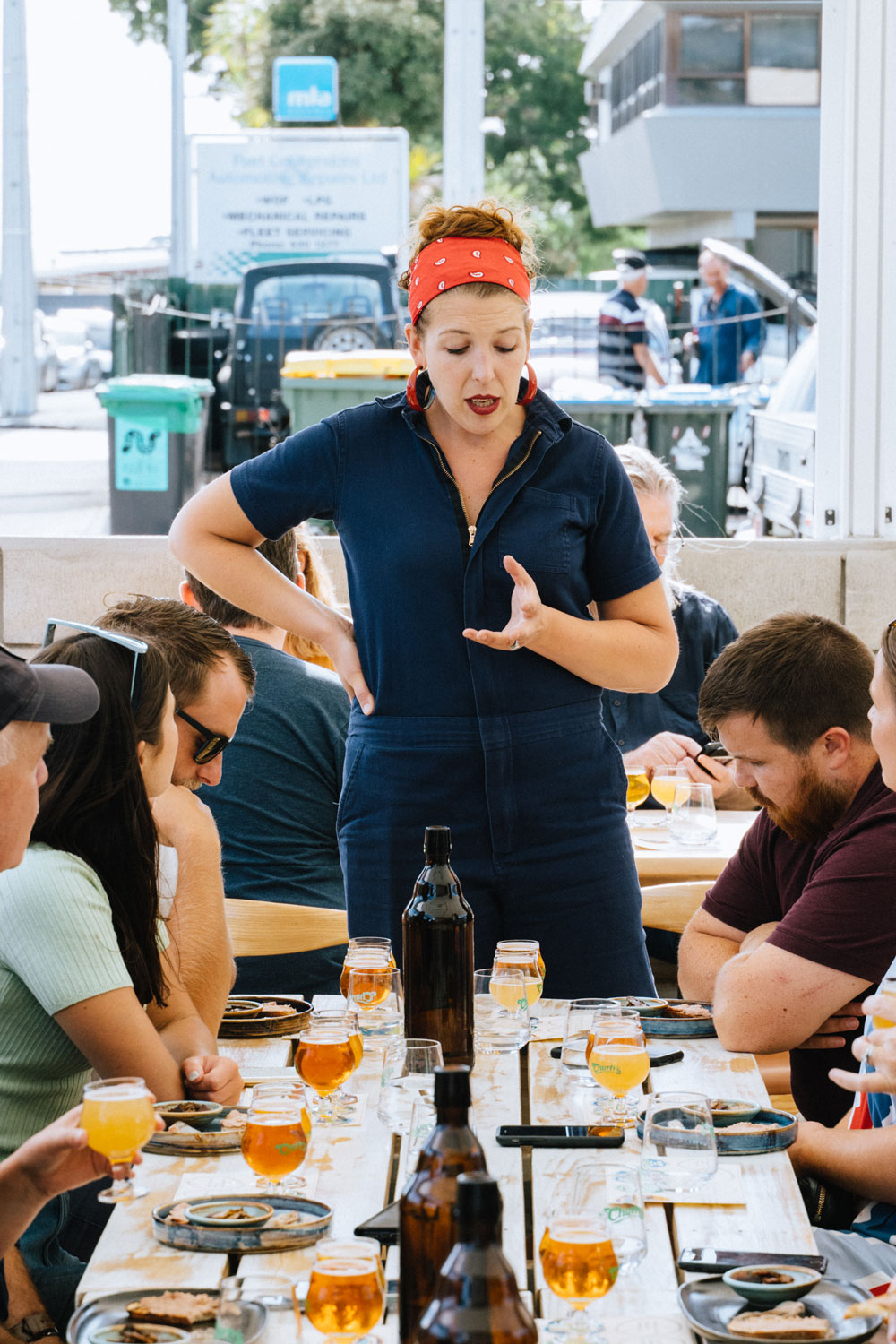 A Lady Butcher, Hannah Miller, talking a crowd of beer fans through a charcuterie and beer match.