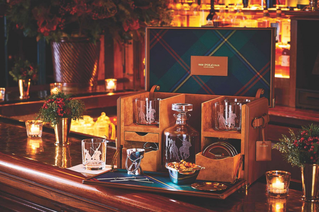 Filled with iconic pieces from the Polo Bar, Ralph Lauren’s first restaurant in New York City, this mixologist box is the ultimate tool kit for cocktail cognoscenti. Included are equestrian-inspired barware essentials such as a hand-cut crystal decanter with sandblasted polo players and four matching double-old-fashioned glasses, as well as a silver-plated brass jigger, a bottle opener, and a nut bowl. The elegant saddle leather carrying case is lined with our signature Wexford plaid wool, which is featured in the dining room’s décor.