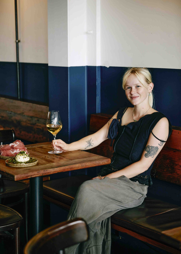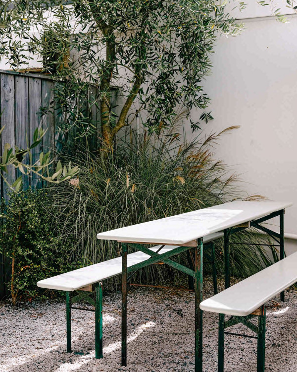 The concept was based on what Ruben and Hannah enjoyed when visiting bars in Europe, with an eye on a simple but relaxed style, and not trying to “be too cool”. And it’s precisely that nonchalance that works to brilliant effect, creating a laid-back, Europe-meets-Aotearoa experience that is, in fact, very cool. The large bar is made of reclaimed kauri, while the walls are painted half in a nautical navy blue and half in subtle cream. The inside space features wooden tables, chairs and stools while outside more communal tables are dotted amongst olives in the charming back courtyard. It was imperative to the duo that everyone, aged 20- 90, could drop in and feel at home, to catch up with friends, work, read or simply enjoy a solo drink, in a safe and friendly environment. But Ruben reckons that while they’ve provided the space, it’s the locals that have made the bar what it is. He comments that they’re always open and chatty to each other, whether they know one another or not, and tells me about one lot of neighbours who live opposite each other, but had never really spoken to each other before, who have become firm friends since connecting at Bar Martin.