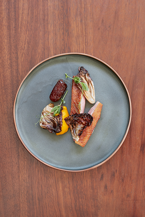 Duck breast with carrot puree, dates, chorizo and grilled radicchio