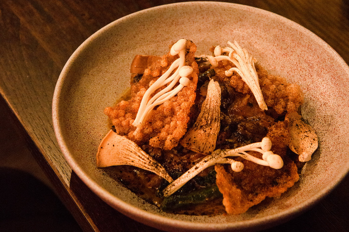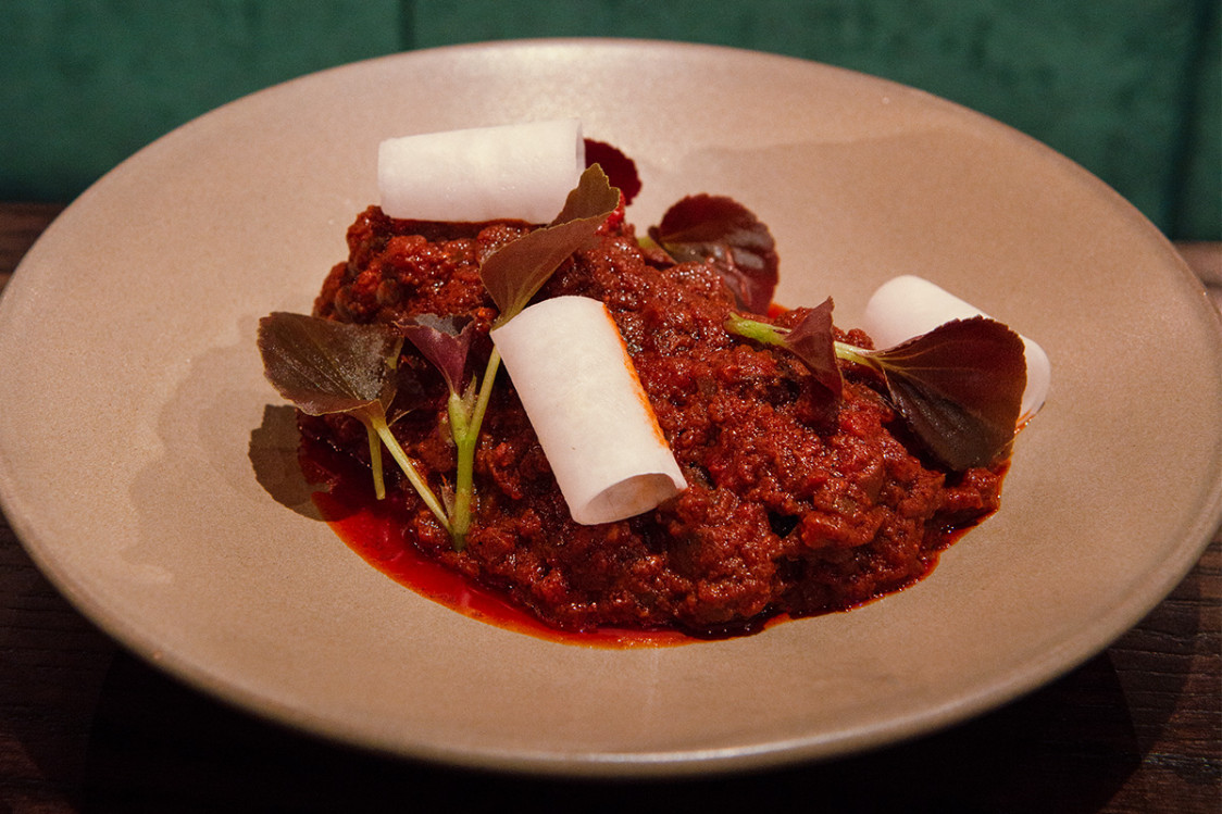 Eschewing any more of the smaller dishes, we then headed straight to the sharing part of the menu with Mushroom, Green Chilli and Truffle. Sid’s menu reads deceptively simply – this surprising combination, with a melding of truffle mushrooms and coconut milk, black garlic and chilli, makes you stop and assess what is happening on your palate with a pleasing recalibration. Vindaloos are often thought to be fiercely hot and not a choice for the spice-shy. We found the Beef Short-rib Vindaloo the opposite – with its rich tomato sauce, the flavours were complex but certainly not over-bearingly hot.