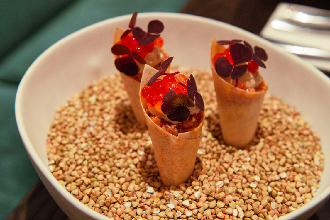 We couldn’t go past the Pani Puri, with potato, chickpea and mint and a very healthy dose of spiced Pani Puri water – these are definitely one-bite wonders! Next, the delectable Goat Cheese and Corn Fritter with ghost chilli, and – my favourite – the Prawn and Crab Cones. With a lightly crunchy spring roll-like exterior, the filling combines crab and prawn with coconut milk and flavour-bursting finger lime, topped with salmon roe. The Tandoori Chicken ‘taco’, with sausage-shaped cylindrical chicken, has a sneaky subtle heat and a crisp slaw on a soft taco.