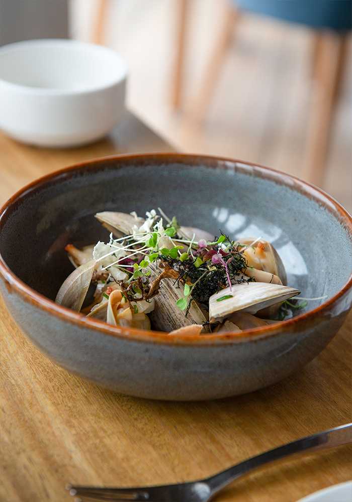 My friend and I settled in to check out the menu and had a difficult time choosing, given the array of options available. I tossed up about trying the Lobster roll with white kimchi, lemon, herbs, pancetta chips and smoked hollandaise (which sounds utterly delicious) but couldn’t go past the Big Glory Bay Salmon with swede, nori granola, ginger daikon and aillade. The salmon was beautifully cooked, tender and luscious, with a beautiful sweep of soft swede and pieces of gentle ginger daikon. The nori granola was intriguing – providing a textural crunch to contrast the rich softness of the salmon. To drink I had a glass of the 2013 Grewacke Riesling (I’m a total sucker for Riesling) and my friend enjoyed a glass of the Wooing Tree 2018 Rose. To eat she chose the Cloudy Bay clams with apple cider, dashi, bonito, lardo di colonatta, garlic chives and seaweed. She declared it to be beautifully tasty, with plump clams and a perfectly pitched ‘broth’.