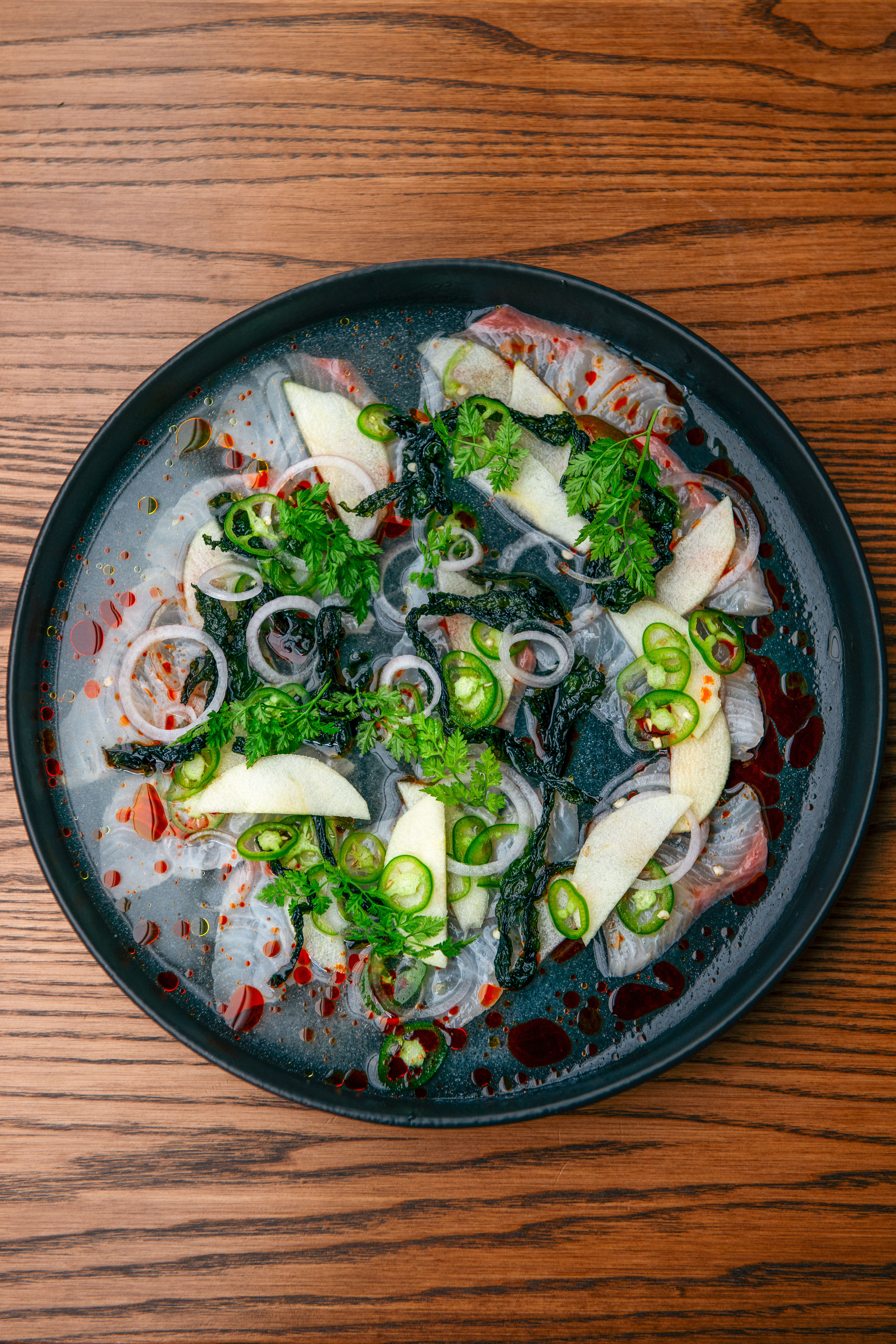 First up we enjoyed Kaipara oysters with pickled white radish and perilla sauce, followed by Mul Hwe, kombu marinated raw kingfish with shallot and apple. The sweet/ tart apple was a beautiful crisp foil for the delicate kingfish.