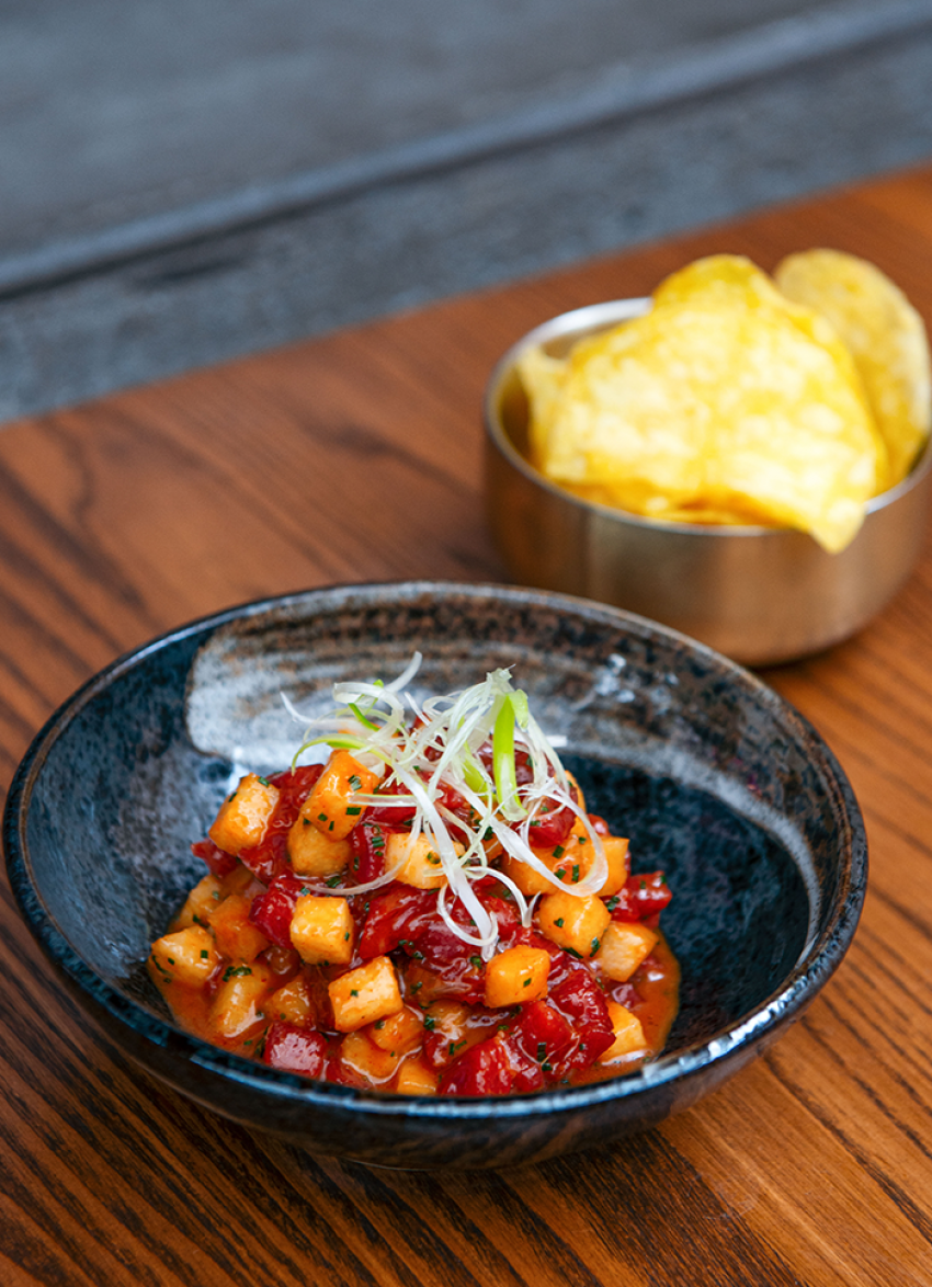 Next up was the Yukhwe, raw beef with egg yolk, pear and potato crisps – not an obvious combination to be sure, but one that worked beautifully!
