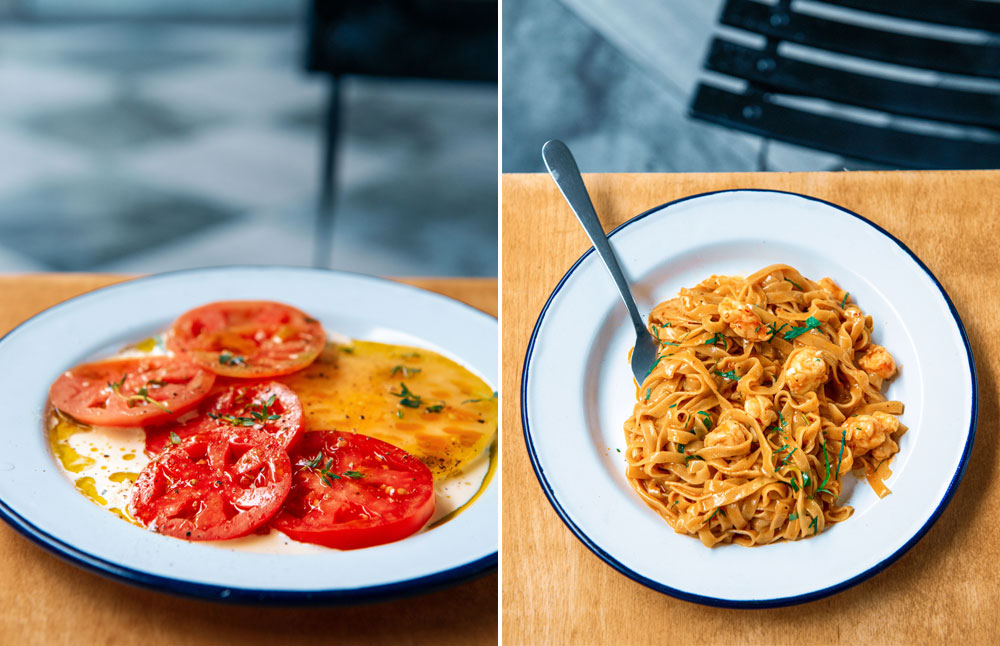 Stracciatella, Tomatoes, White Balsamic and Fettucine, Prawns, Nduja, Bisque.