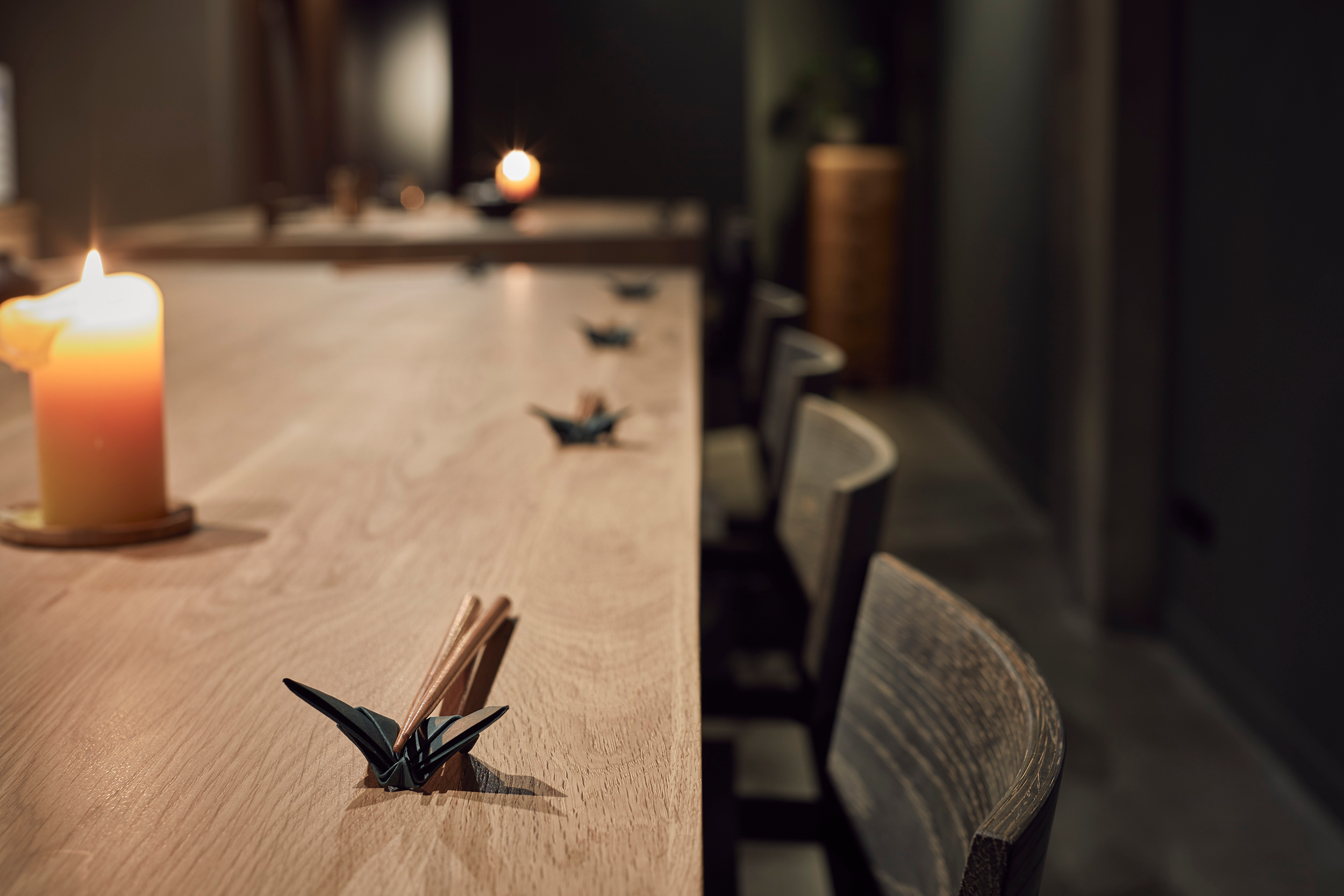 The evening we visited it was cool and dark, so it was a welcome surprise to find a small log fire burning on the footpath outside, where we waited for the door to be answered. Stepping inside we were invited to take a seat at one of the two beautifully crafted blond wood islands and offered a warm towelette as a small bowl of fried seaweed with vinegar was placed in front of us. And so the evening began, five cocktails created for each of us, with the option to reject if they weren’t to our taste, accompanied by five exquisite small courses.