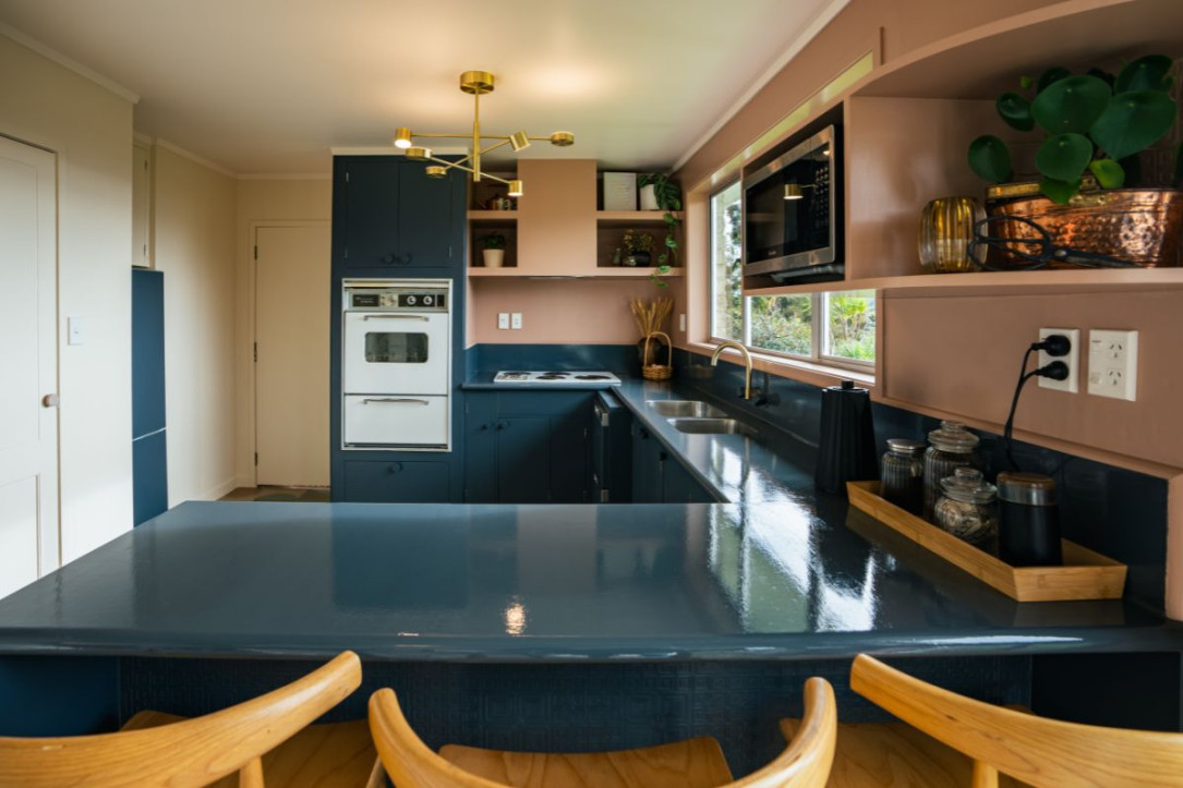 When design duo Alice and Caleb tackled the kitchen refresh in their latest home makeover they used Resene colours to create a ’70s-inspired look that looks modern and fresh, while remaining relevant to the era of the Auckland house.