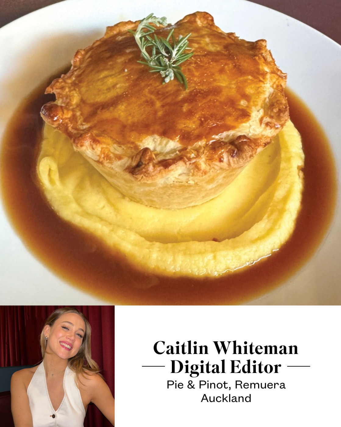 My partner’s parents mentioned a new local spot, Pie and Pinot, and asked if we’d like to join. Did I already have dinner plans with friends? Yes. Was I about to turn down a pre-dinner pie? Absolutely not. Expecting a humble pie shop, I was shocked to find one of the most stylish upmarket pubs I’ve seen in Auckland. We were perched in the corner with rain pouring outside and a menu asking me to pick between a pie or sausages and my preferred style of mash. Assuming I’d be a problem child with my dairy intolerance, I was surprised to find ‘The Victorian’, a mushroom pie with shiitake, field and portobello mushrooms, spring onion, oat milk and a side of vegan mash. It was a tear-worthy moment. The later reservation was cancelled. pieandpinot.co.nz@pieandpinot