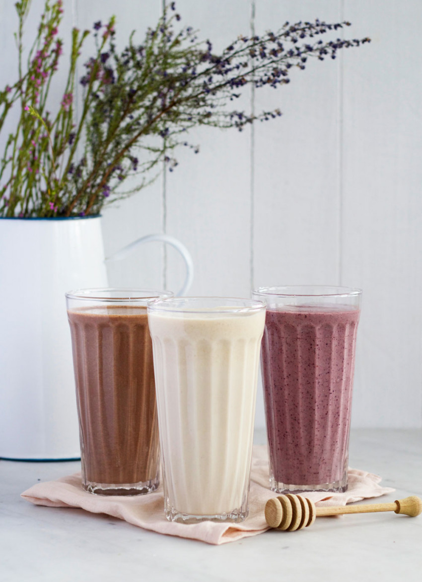 Kelly's three favourite smoothie recipes are Cacao, Almond Butter and Banana; Vanilla, Walnut, Honey and Oat; and Berries and Mint.