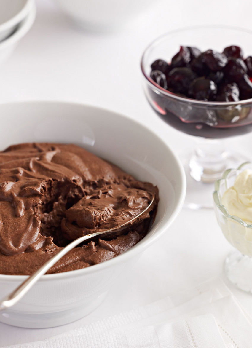 To serve: Tip the cherries and whipped cream into serving bowls. Pass the mousse, allowing everyone to help themselves. Top with a spoonful of cherries and cream.