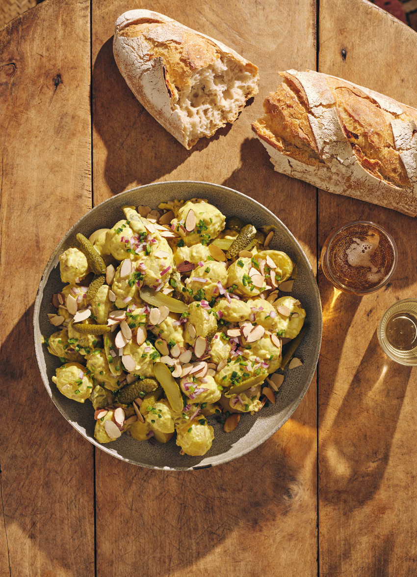 Tart cornichons, crunchy almonds and waxy potatoes are tossed in a light coronation-style dressing for a salad that’s happy to sit on any summer dinner table.