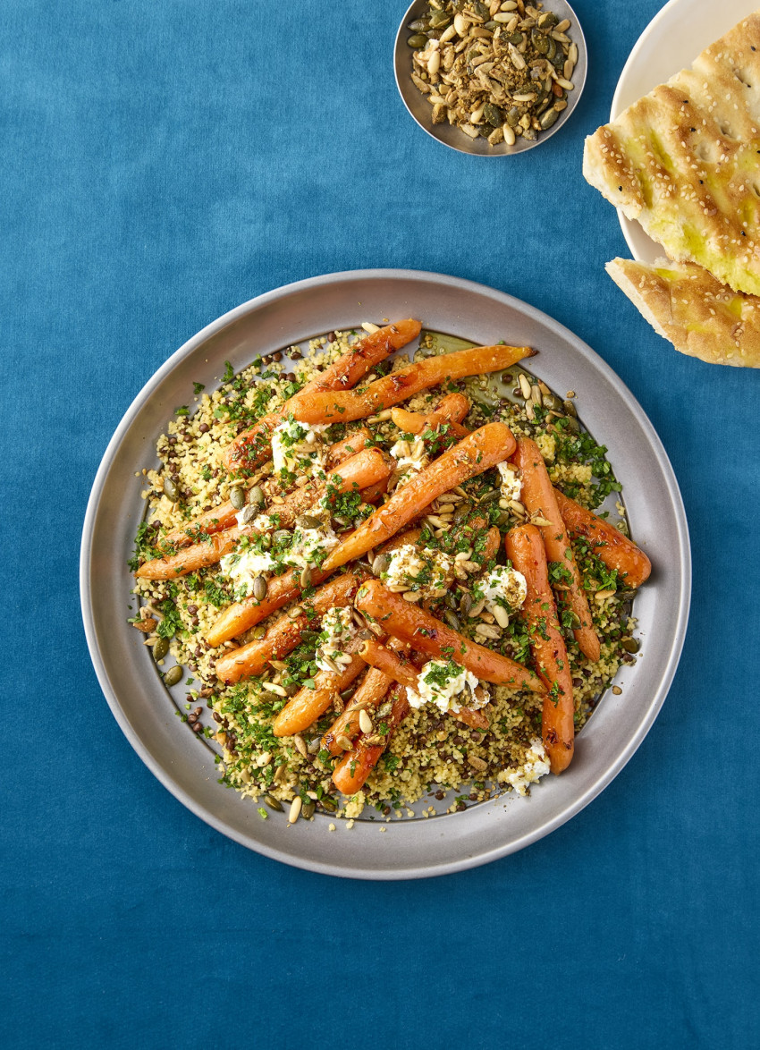 Toss through the lemon zest, garlic, cumin seeds, ground cumin, lentils, parsley and half each of the dukkah, pine nuts and toasted seeds. Tip onto a large serving plate and top with the carrots, feta and remaining dukkah, nuts and seeds. Top with a drizzle of olive oil, salt and pepper.