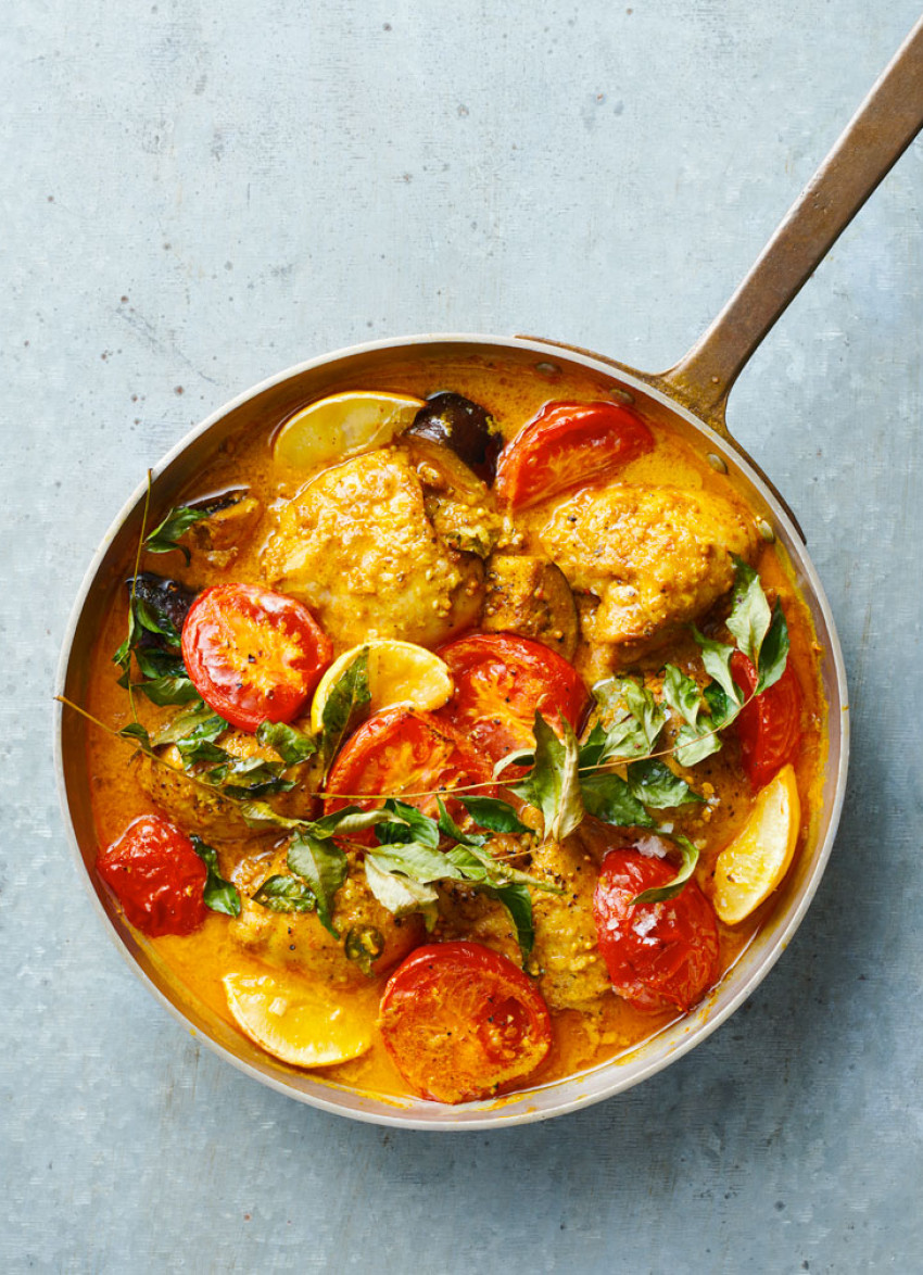 Tip into the sauté pan and fold the thighs to make plump parcels. Nestle in the tomatoes and lemon quarters and place the sprigs of curry leaves on top.