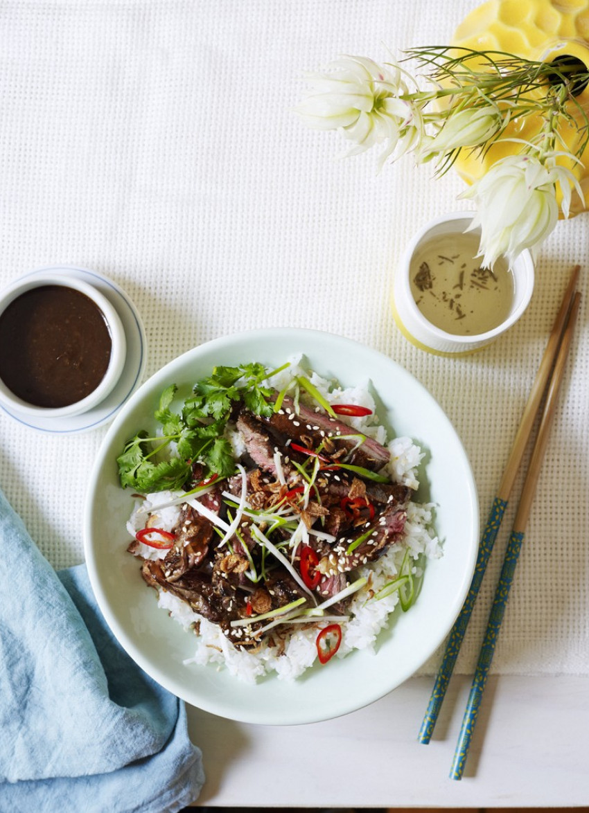 To serve: Place the rice on plates. Slice the steaks against the grain and place on the rice. Spoon the resting juices over the steaks with a spoonful of the glaze. Scatter over the garnishes of choice.