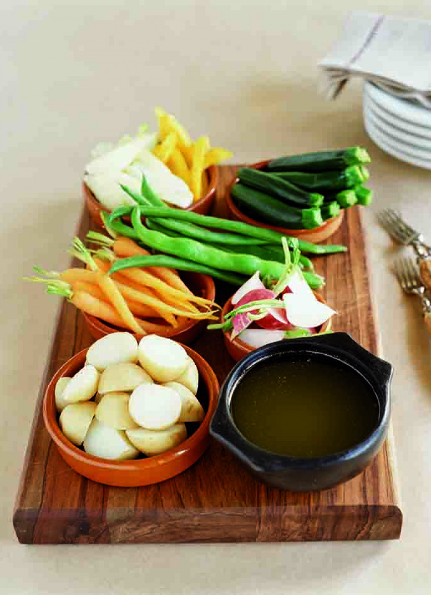 To serve: Arrange the vegetables on a serving platter and serve with the hot bagna cauda. Vegetables are dipped in the sauce or a selection of vegetables can be placed on serving plates and the sauce spooned over.