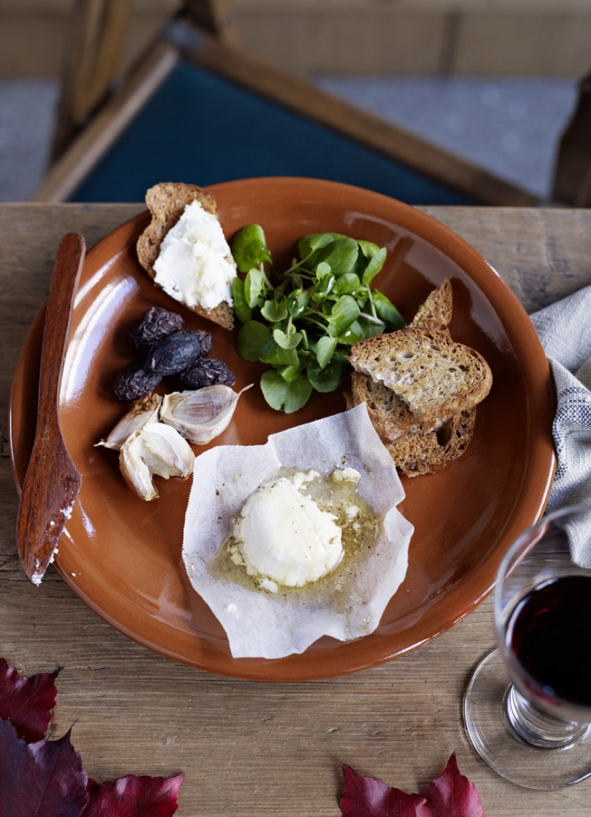To serve: Place the cheese, still on the paper, on serving plates with the olives, whole garlic cloves, crostini and a small stack of salad leaves. Serve immediately.