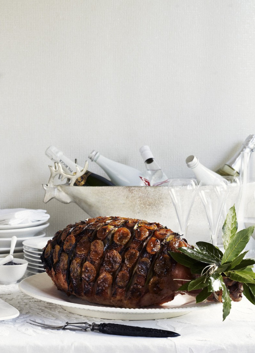 Ham: Remove the skin from the ham using your fingertips to gently prise it away, taking care not to damage the fat. Leave the skin on the hock. Score the fat around the circumference of the ham, 3 cm apart and just deep enough to hold half a bay leaf. Cut the bay leaves in half along the spine. Insert, cut edge down, into the cuts in the ham.