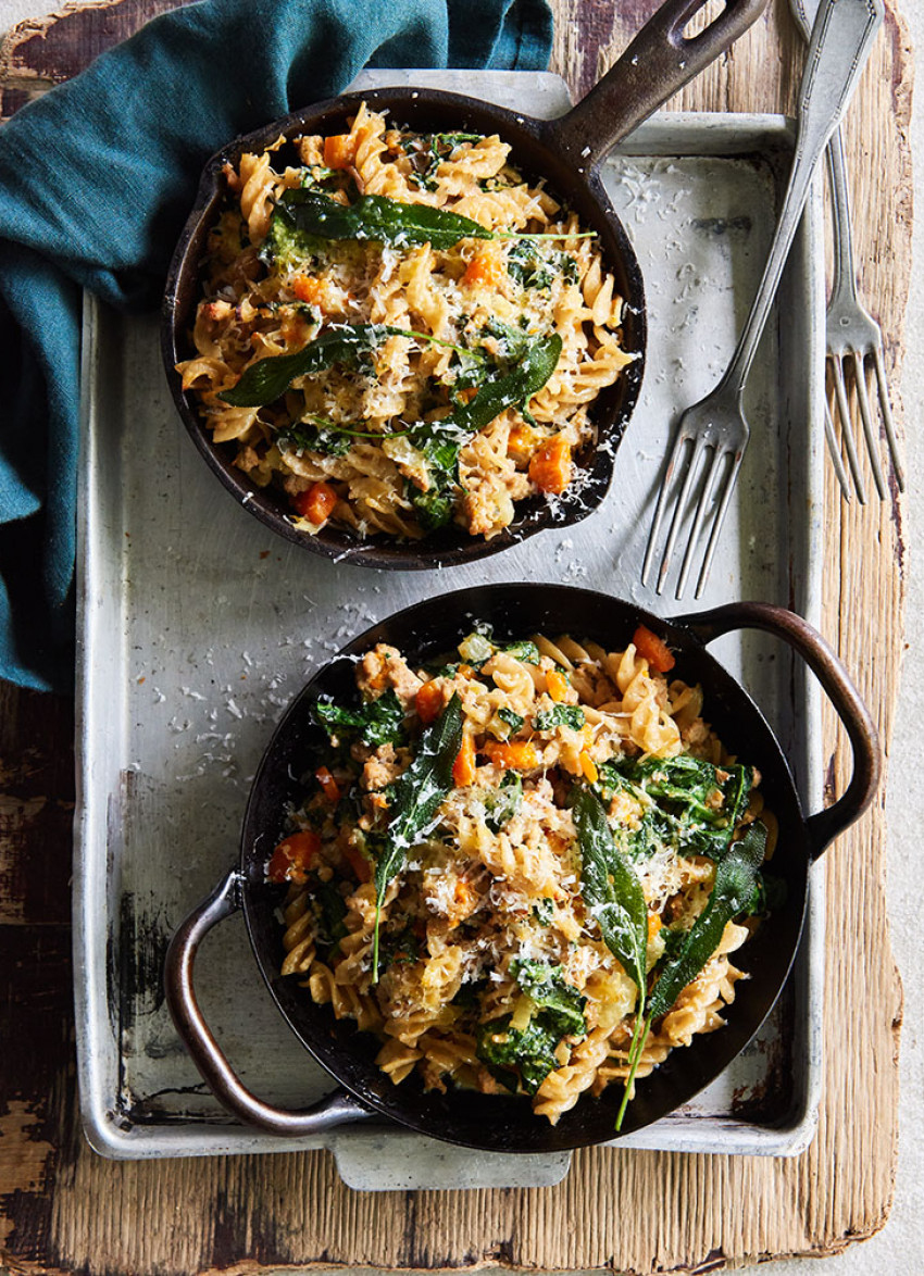 To assemble: Stir the cooked pasta into the sauce along with a good grating of parmesan. Divide between the baking dishes and top with another generous grating of parmesan. Bake for 20 minutes or until lightly golden on top and bubbling. Serves 4–6.