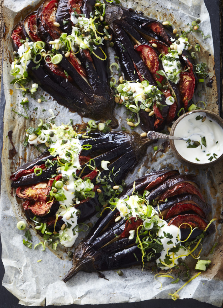 To serve: Dollop spoonfuls of yoghurt over the top of the eggplants, then scatter over the topping.