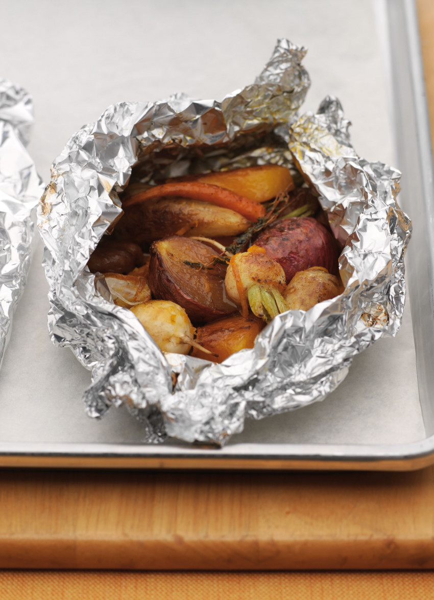 Spoon the sauce over each portion of vegetables and fold over the foil to seal in the vegetables and their juices. Transfer to a large baking tray and roast for 20-30 minutes. Cooking time will depend on the size of the vegetables. Remove the parcels from the oven and serve straight from the foil or transfer to serving plates.