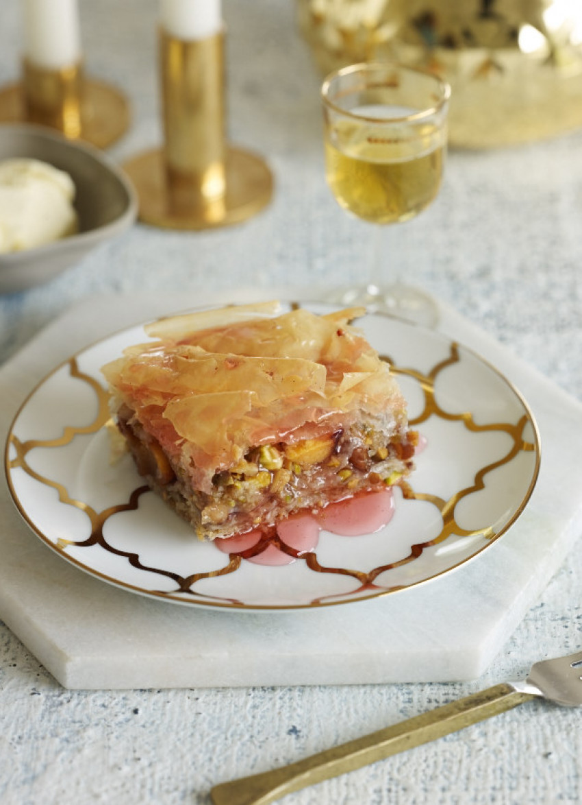 To assemble: Once cooled, reheat the syrup remaining in the pan to bubbling, then spoon over the baklava. Leave the baklava to cool completely before slicing into squares for serving with the reserved cooled syrup.
