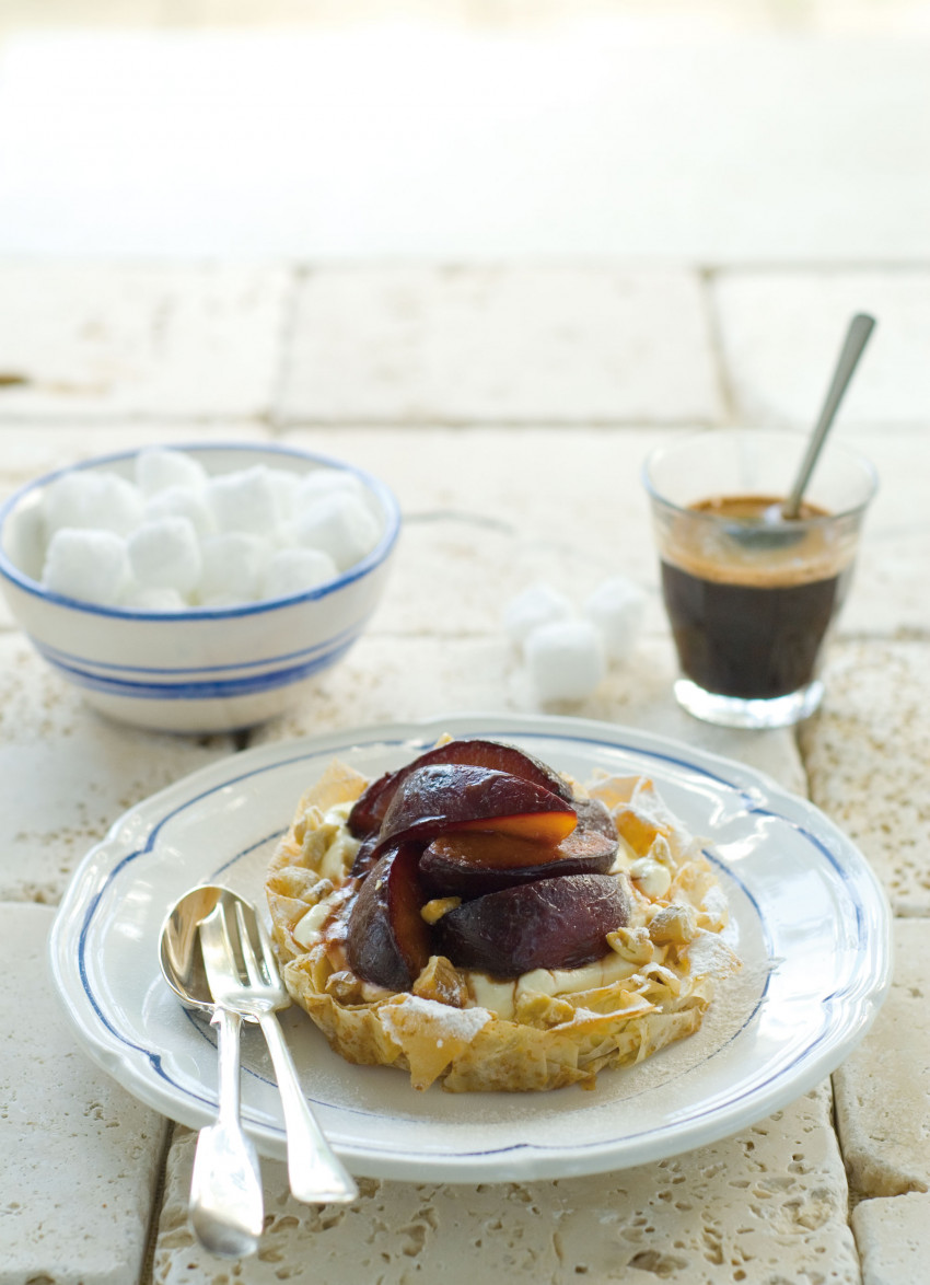 Lay one sheet of filo on the bench, keeping the others covered with a damp tea towel. Brush with butter and sprinkle with a little filling. Fold in half and repeat with the butter and filling. Fold in half again to make a square of filo. Brush with butter only. Gently push into lightly greased 10 cm tart tins or Texas muffin tins. Repeat with the remaining 5 sheets. Bake until golden and very crisp. Set aside to cool.