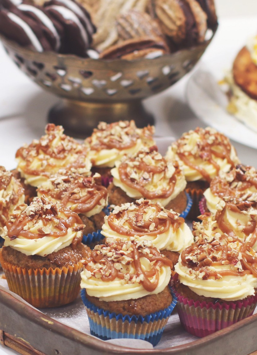 To assemble: Pipe or spoon the icing onto the cupcakes. Drizzle with salted caramel and a sprinkle of pecans. Cupcakes will keep for 3 days in an airtight container. Makes 12.