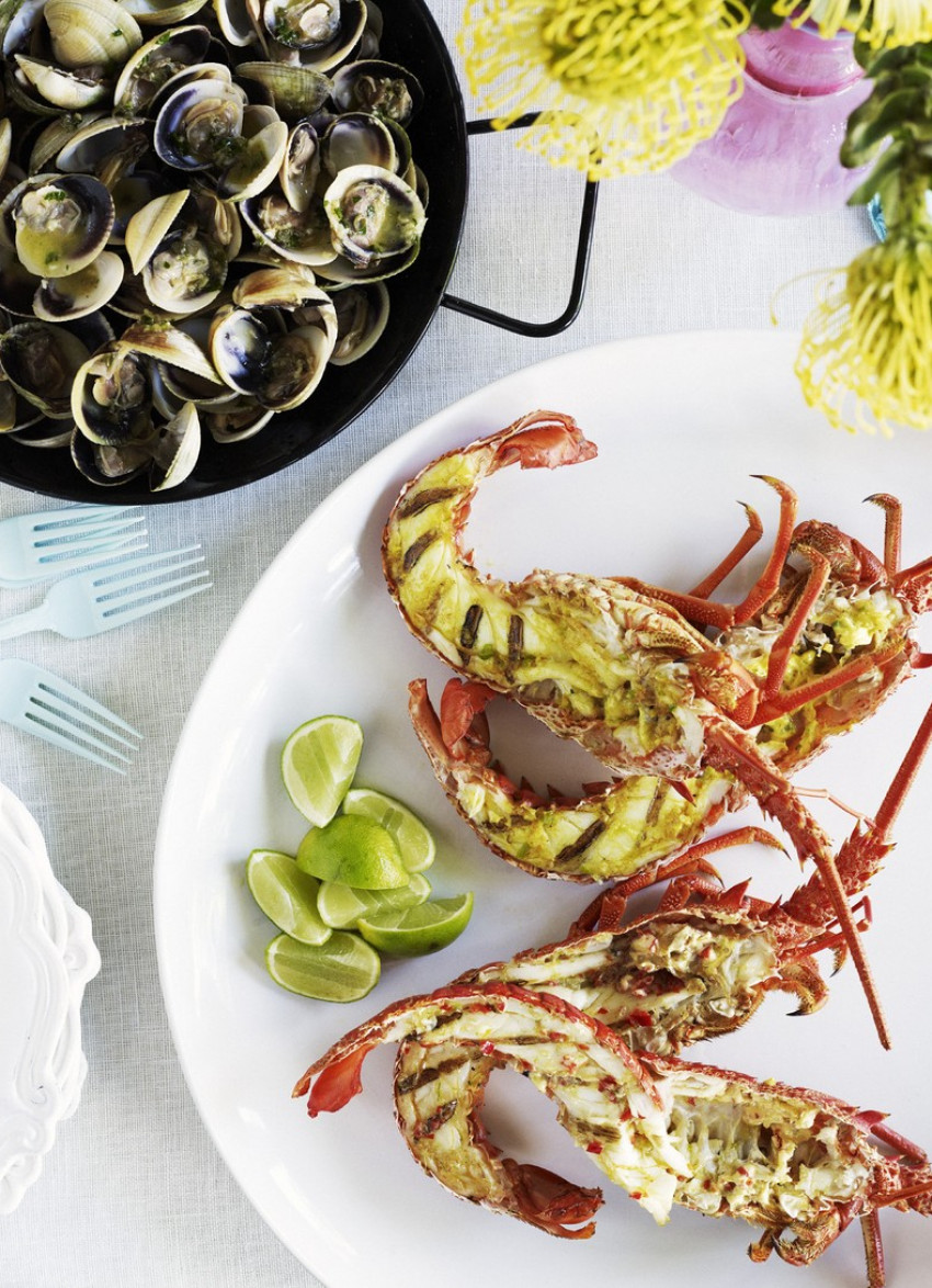 Place each half, shell side down, on the preheated barbecue and spread the flesh side with a little flavoured butter.
