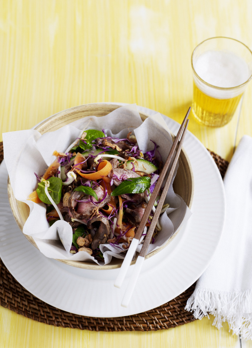 Put all the salad ingredients and half the shallots in a large bowl and toss with the reserved dressing. Lift the beef out of the dressing and toss with the salad. Divide between serving bowls and scatter with the remaining shallots and extra Vietnamese mint if desired.