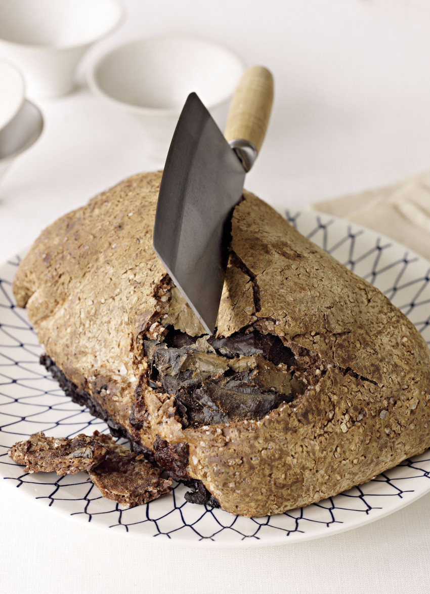 Wrap the chicken in the dough, wetting the edges to seal and smoothing the joints so there are no holes for the steam to escape. Place breast side up in a roasting tray and cook for 3.5 hours.