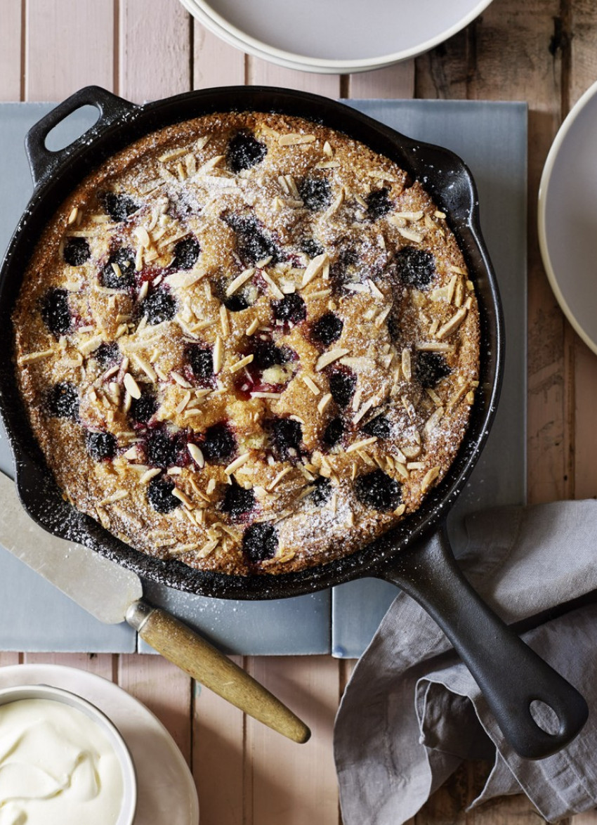 Tip into the skillet or tin and smooth the top. Scatter over the blackberries and almonds then the sugar.
