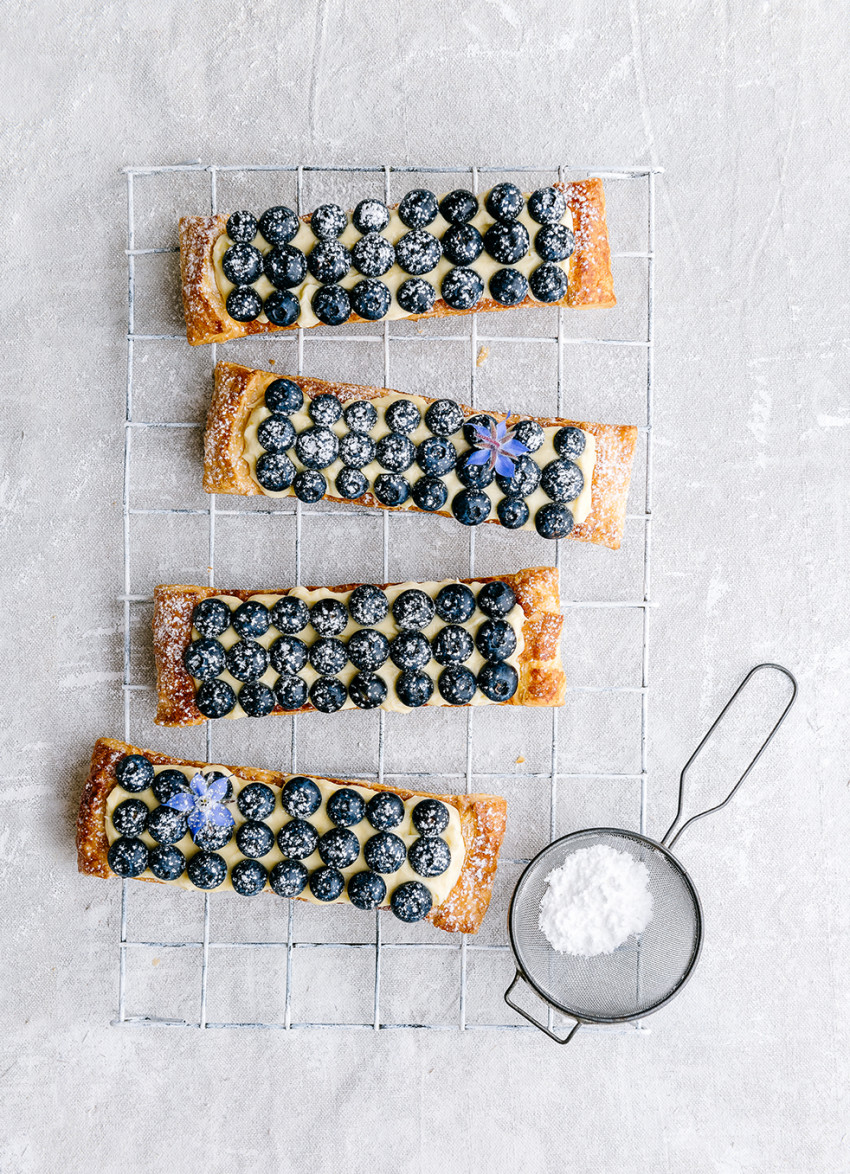 Spoon the cream into the pastries and arrange the blueberries in a single layer over the filling. Top with borage flowers and dust with icing sugar to serve.