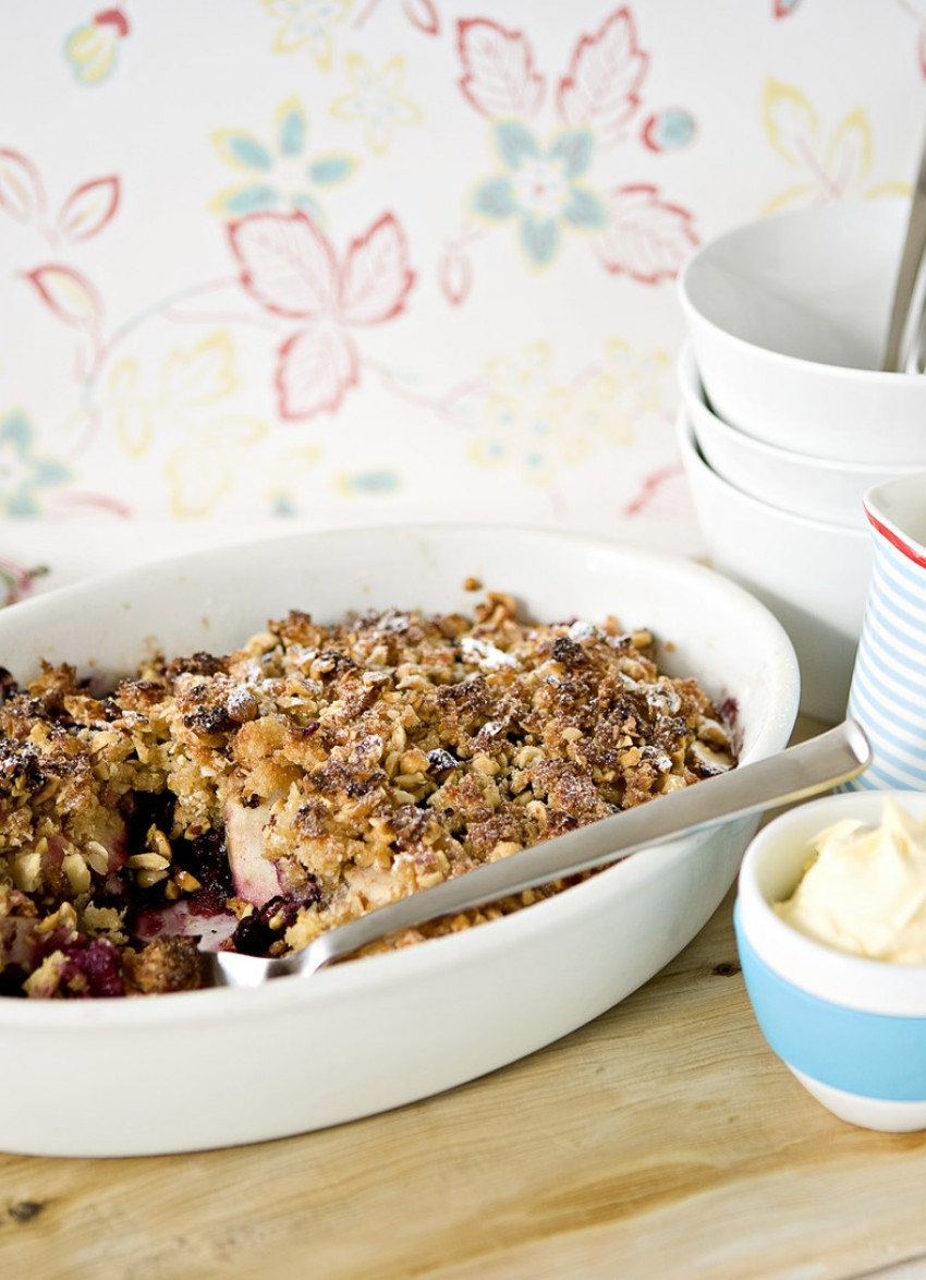Similar to an apple crumble, this warming dessert recipe is best served in winter. Don't forget the custard.