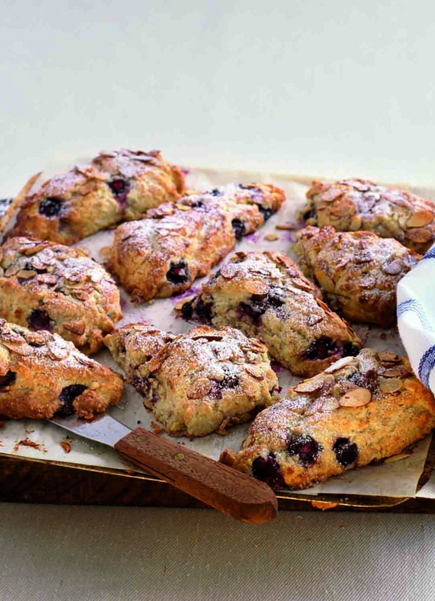 With as few strokes as possible, use a fork to stir until the mixture is just holding together. Take care not to crush the blueberries or the juice will turn the dough purple. Tip onto a well floured bench. The dough will be soft and shaggy looking. Flour your hands and gently bring the dough together and shape into a long rectangle about 3 cm thick. Do not use a rolling pin. Combine the almonds and melted butter and scatter over the dough. Sprinkle generously with the combined cinnamon and sugar. Use a sharp knife to cut the dough into 10-12 triangles. Transfer them to a lined baking sheet and bake for 30-35 minutes or until a good golden brown.