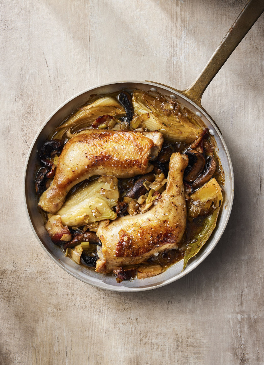 Heat the oil and butter in a large frying pan. Season the chicken and brown well on both sides. Transfer to a plate. Add the bacon, leek, fennel, bay leaves, garlic and rosemary to the pan and cook for 5 minutes. Add the mushrooms, season and cook for another 5 minutes, turning frequently. Nestle the chicken into the vegetables along with any resting juices. Increase the heat and pour over the Marsala. Let it bubble up, then add the stock and bring back to the boil. Place in the oven and braise for 40 minutes, or until the chicken is cooked through.