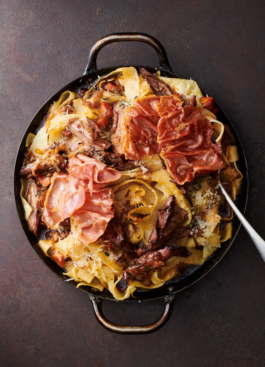 COOK’S NOTE: I like to braise the duck 1-2 days ahead of using. Strip off the meat and add back to the pan then cover and refrigerate. Spoon off and discard all the fat that will have set on the surface before tossing with the pasta and reheating.