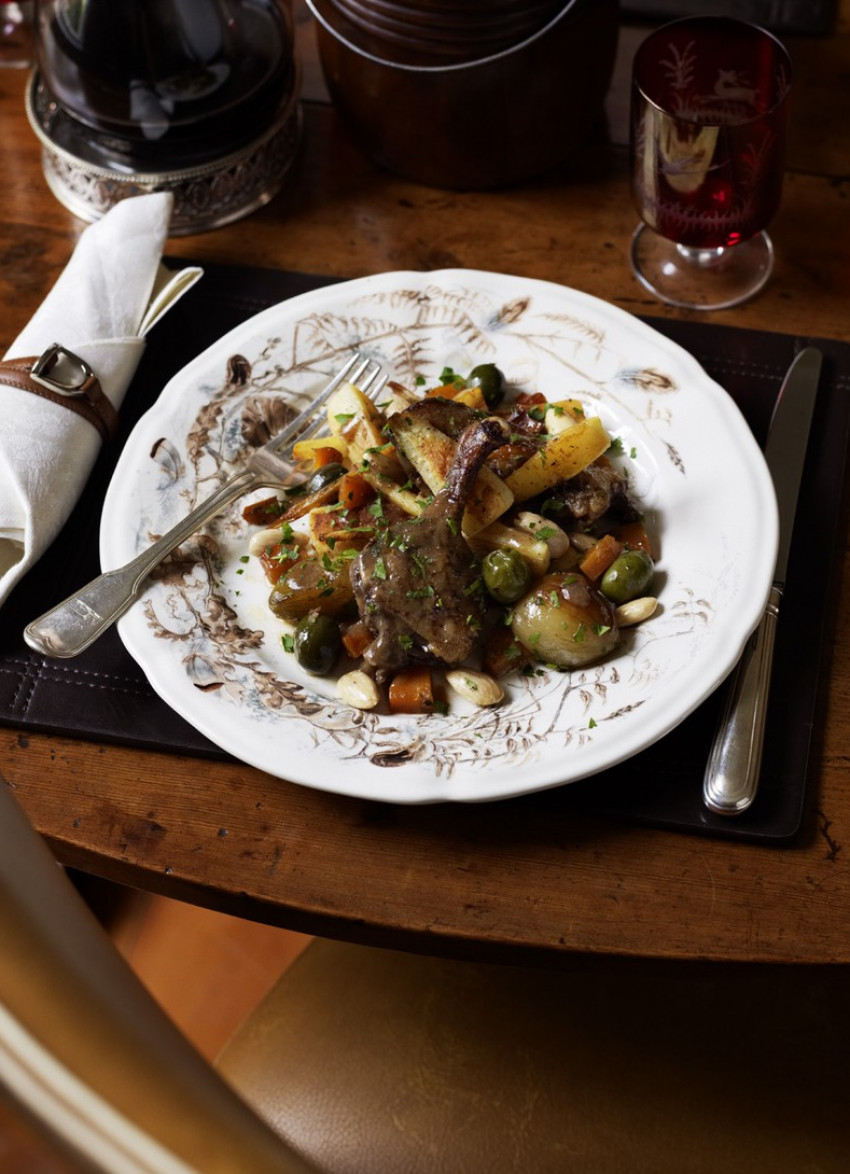 Season and place the duck, skin side up, among the vegetables. If needed, pour in more stock to come half way up the duck but not to cover the skin. Place in the oven and cook, uncovered for 1¼ hours, turning the onions and basting the duck occasionally. Do not turn the duck. The duck should be very tender with crispy skin and the juices reduced by the end of cooking. Place the casserole on a board and tilt gently to one side. Using a spoon, carefully scoop off any fat lying on top of the pan juices. Scatter over the almonds and parsley just before serving. We served the duck with roasted parsnips.