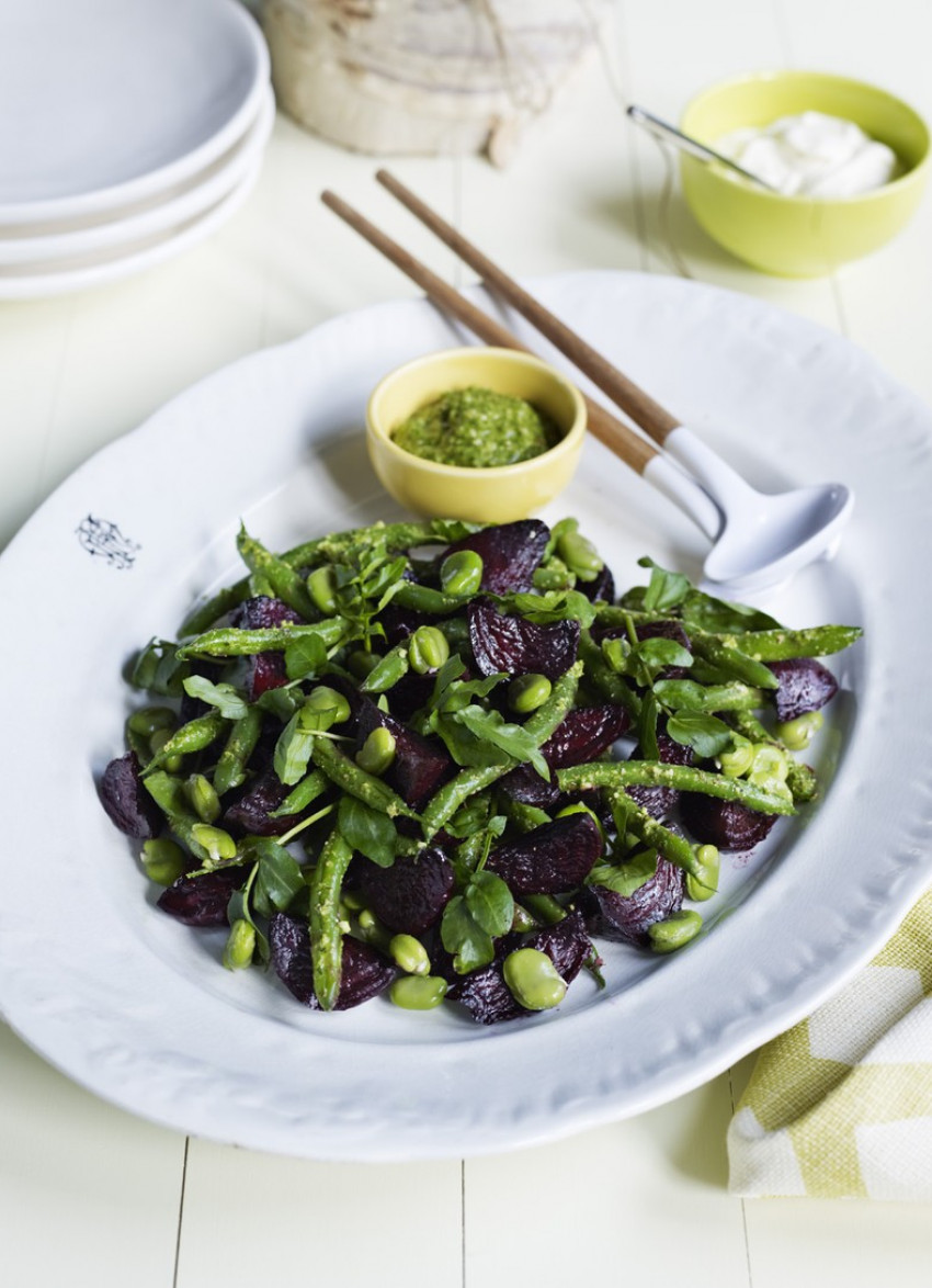 To serve: Toss the green beans with half the pesto. Spoon half the beetroot onto a serving dish and top with half the broad beans, green beans and watercress. Repeat the layers with the remaining ingredients. Drizzle with yoghurt, olive oil and pepper and serve the remaining pesto separately.