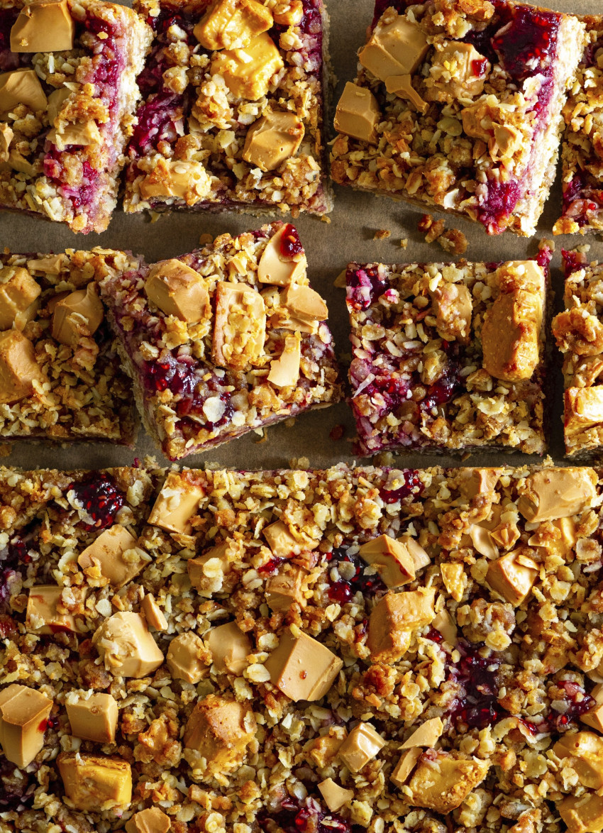 Brown Butter, Oat, Raspberry and Caramelised White Chocolate Slice