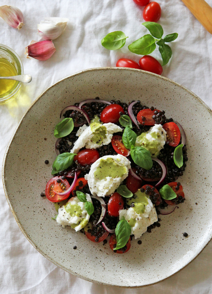 Lovely beluga lentils have a firmness and a glossy dark colour that makes them a beautiful addition to salads. Use the best quality buffalo mozzarella you can, it makes a huge difference to the salad.