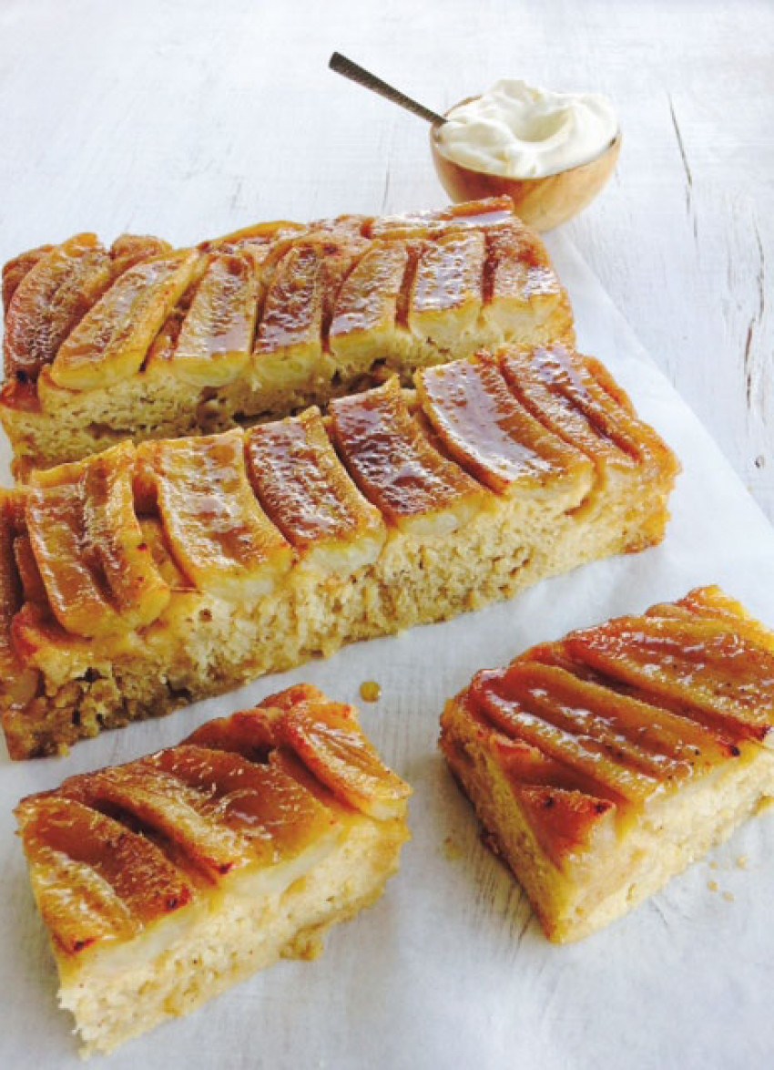 Base: Put the butter, sugar and cinnamon in a small saucepan and bring to the boil, stirring to dissolve the sugar. Add the rum and boil gently for 4 minutes. Cool for 5 minutes then tip into the base of the tin.